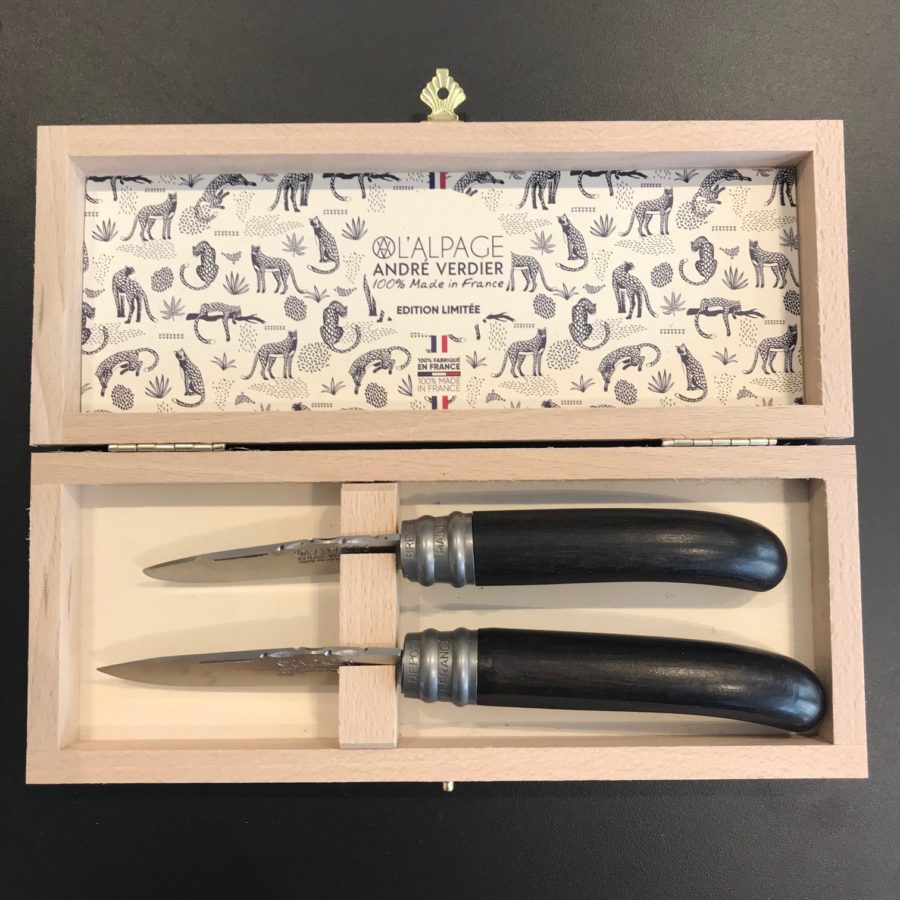 Dans ce beau coffret en bois, vous trouverez deux magnifiques couteaux pliables fabriqués à Thiers.