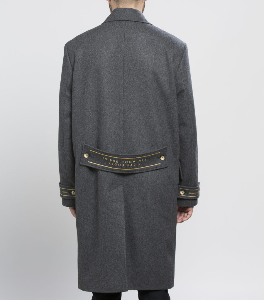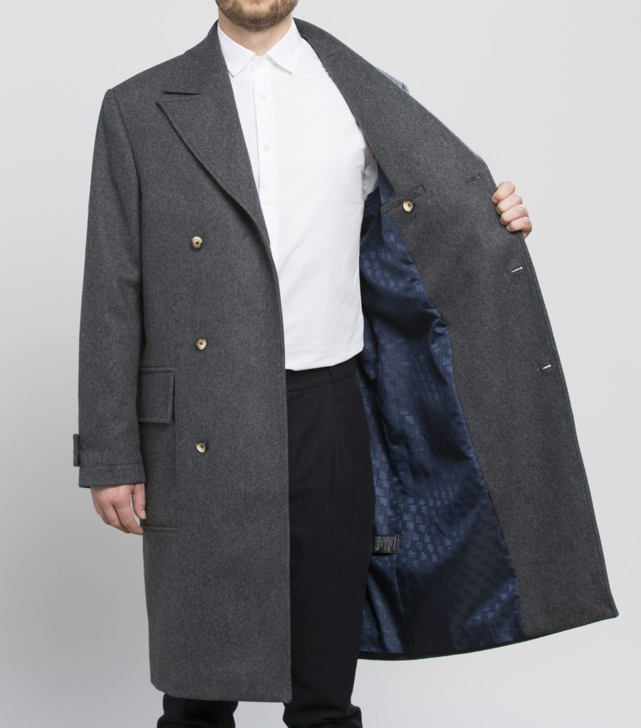 Manteau classique à double boutonnage conçu dans subtil mélange de laine et de cachemire. Entièrement doublé. Martingale amovible. 2 grandes poches à rabat sur le devant. 2 poches intérieures passepoilées et 1 poche intérieure zippée.