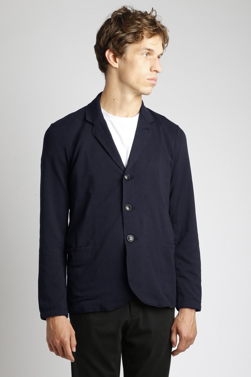 Veste tailleur bleu marine fabriquée dans une maille ‘gumy’ mélange coton/élasthanne. Poches passepoilées fendues. Coupe classique.