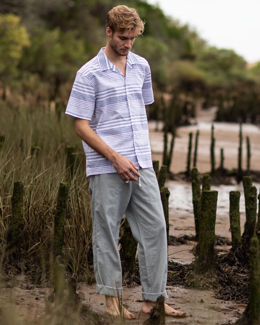 Pantalon de détente en coton léger, rayures bleues, 100% coton, coupe droite.