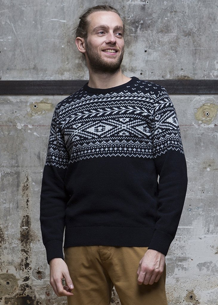 Pull bleu marine en laine mélangée à la coupe droite, aux manches longues et au col rond. Il se pare d’un motif jacquard blanc sur la moitié haute. Finitions à bords-côtes.