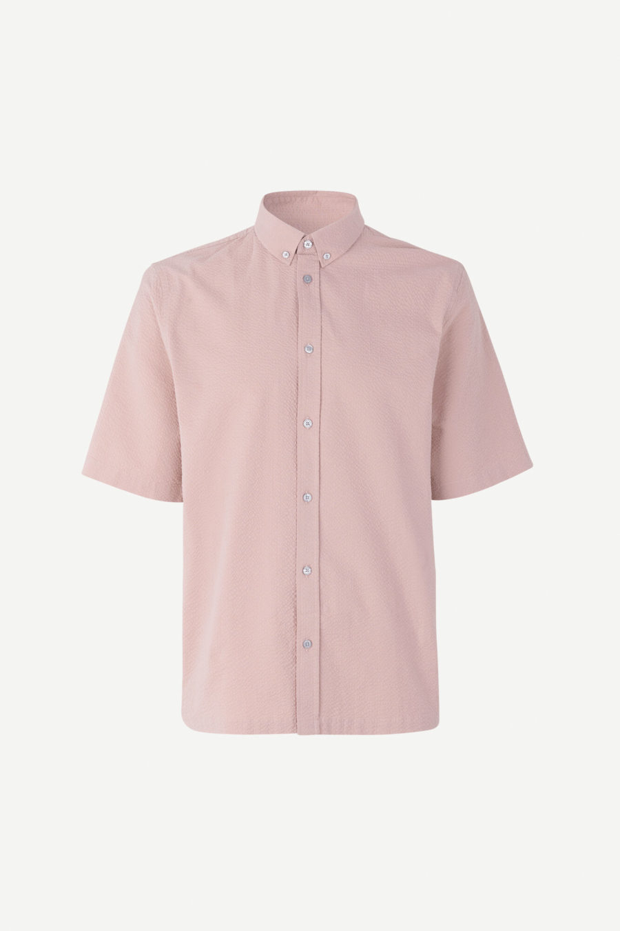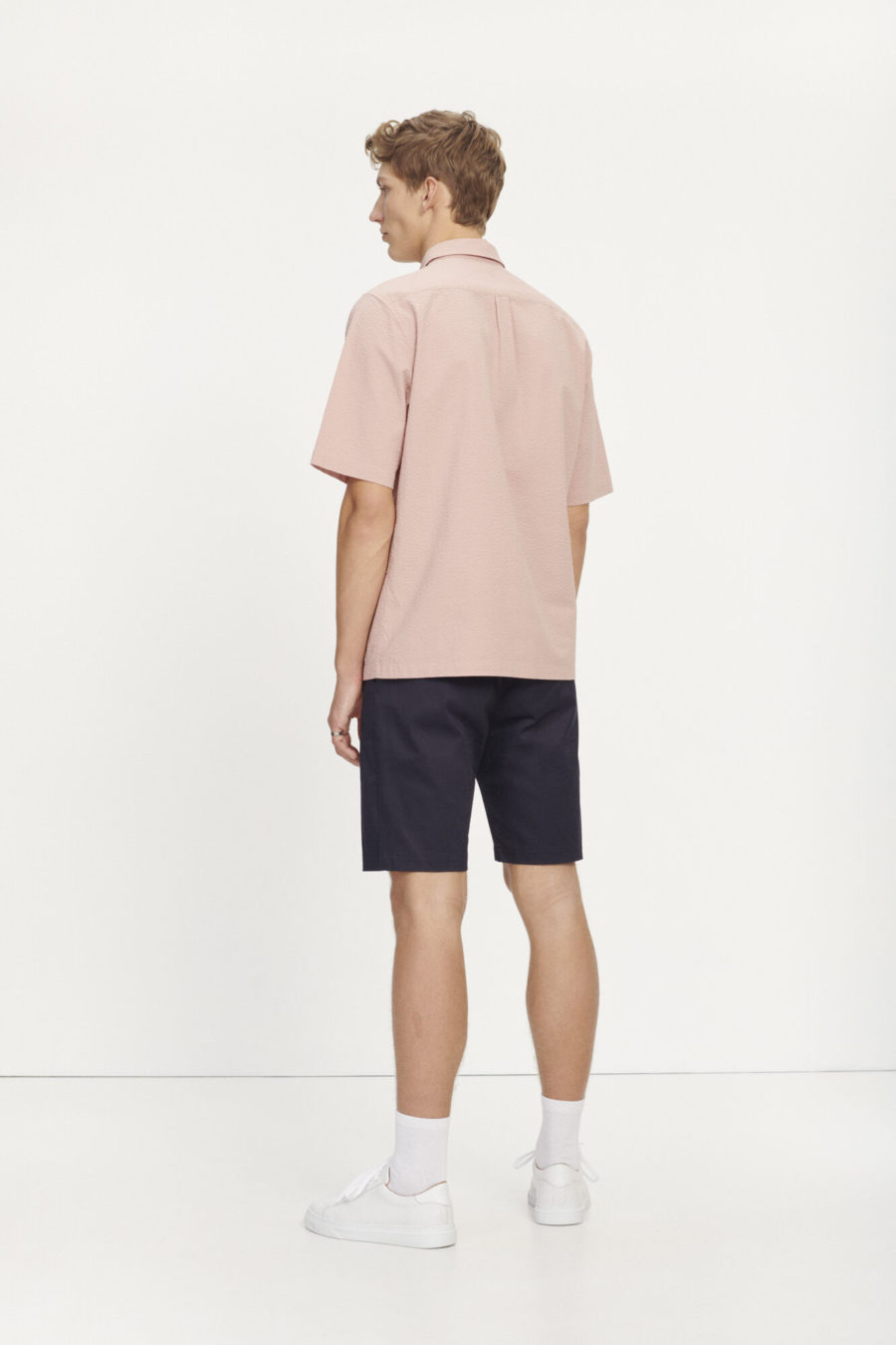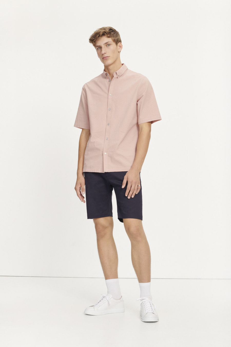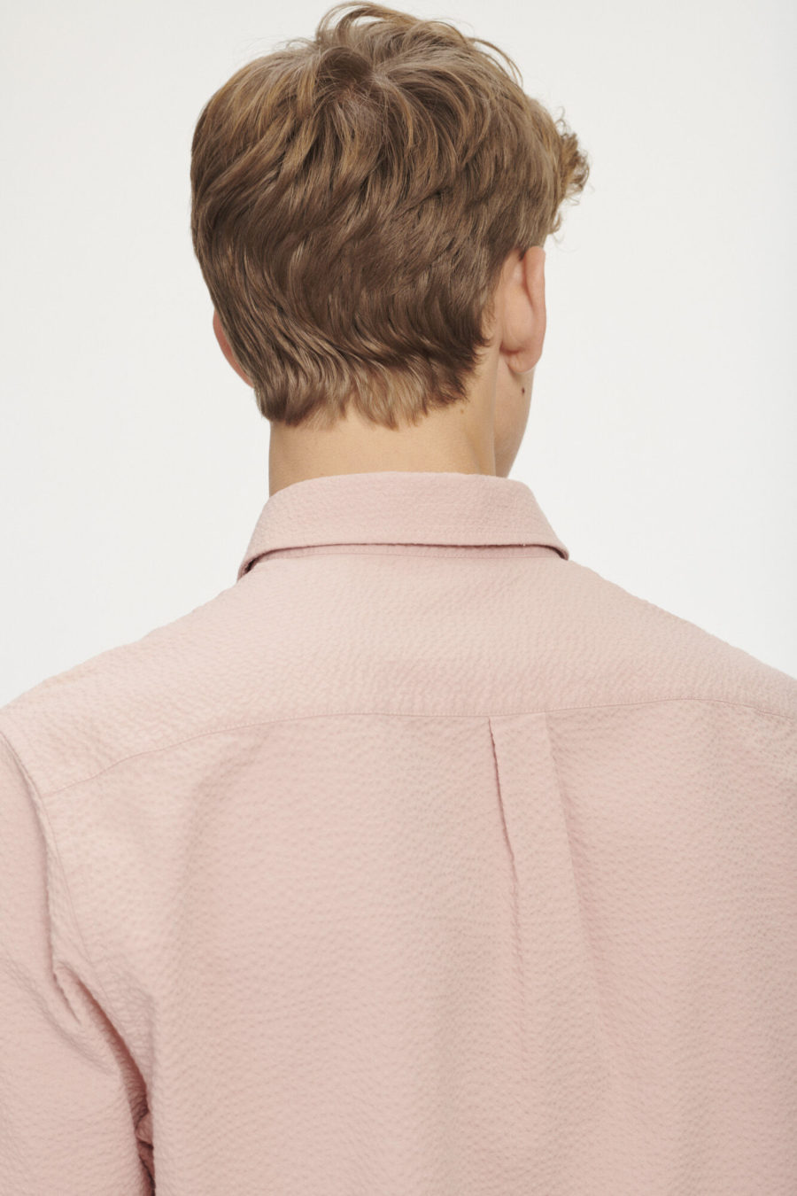 Chemise à manches courtes. Col boutonné. Empiècement plissé dans le dos. Coupe carrée. Coton stretch avec surface texturée en seersucker. Légère finition de lavage.